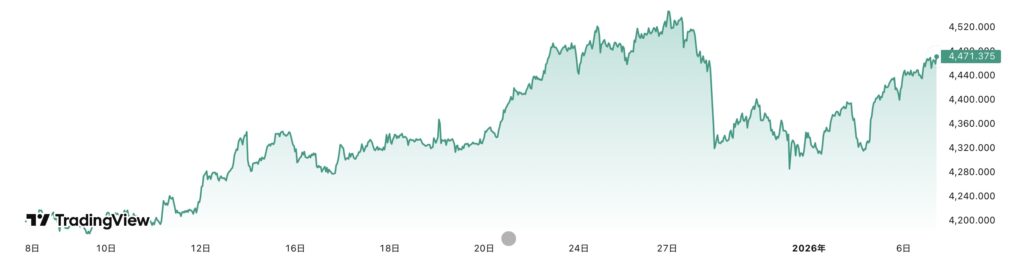 4,500ドル手前での利益確定売りと、4,430ドル付近での押し目買いが拮抗。RSIの過熱感を冷ますための「時間調整」が入り、4,400〜4,500ドルのレンジで高値保ち合いとなります。