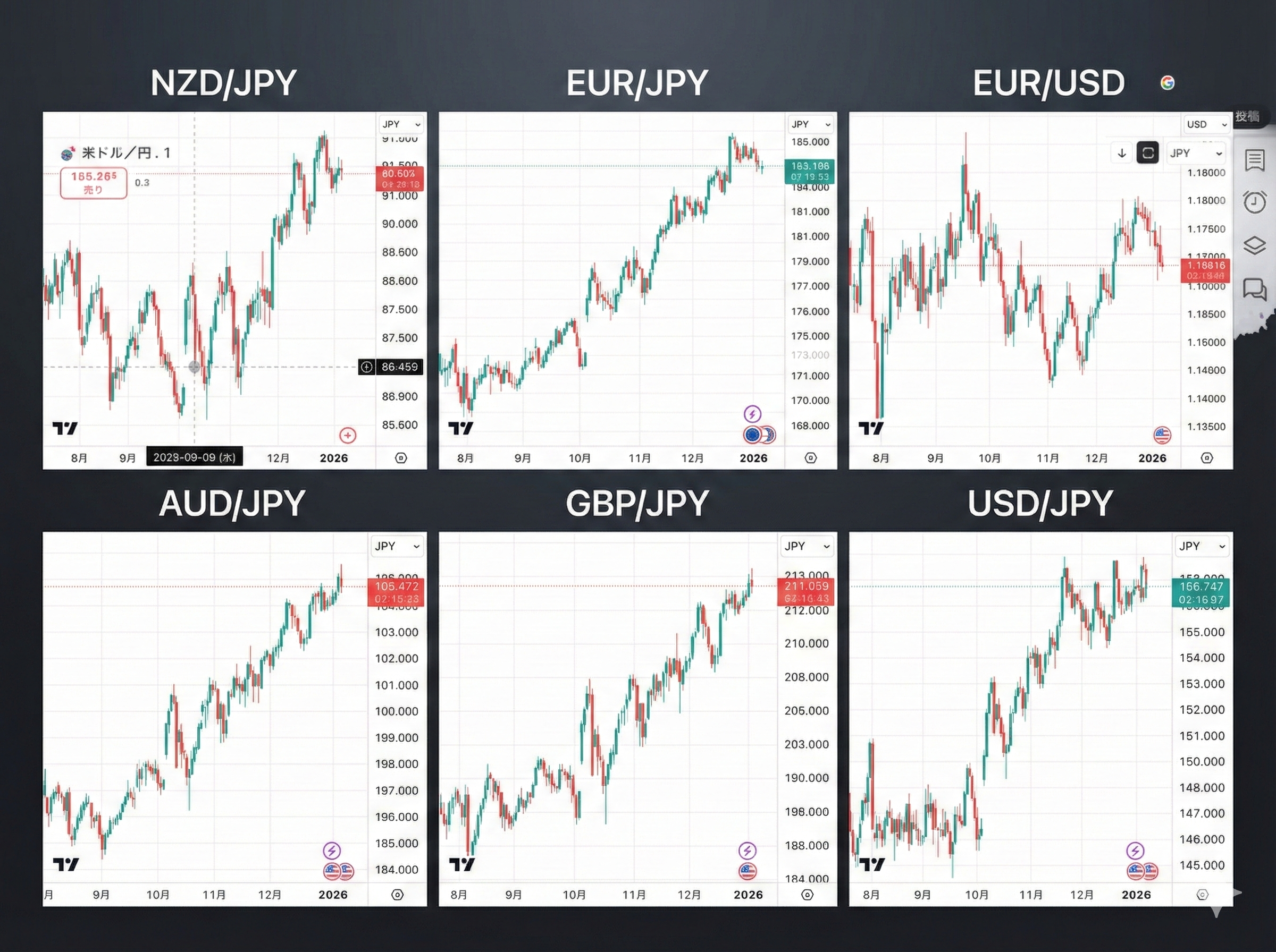 ドル円が158円という壁に挑むその横で、クロス円は既に青空圏を駆け上がろうとしています。