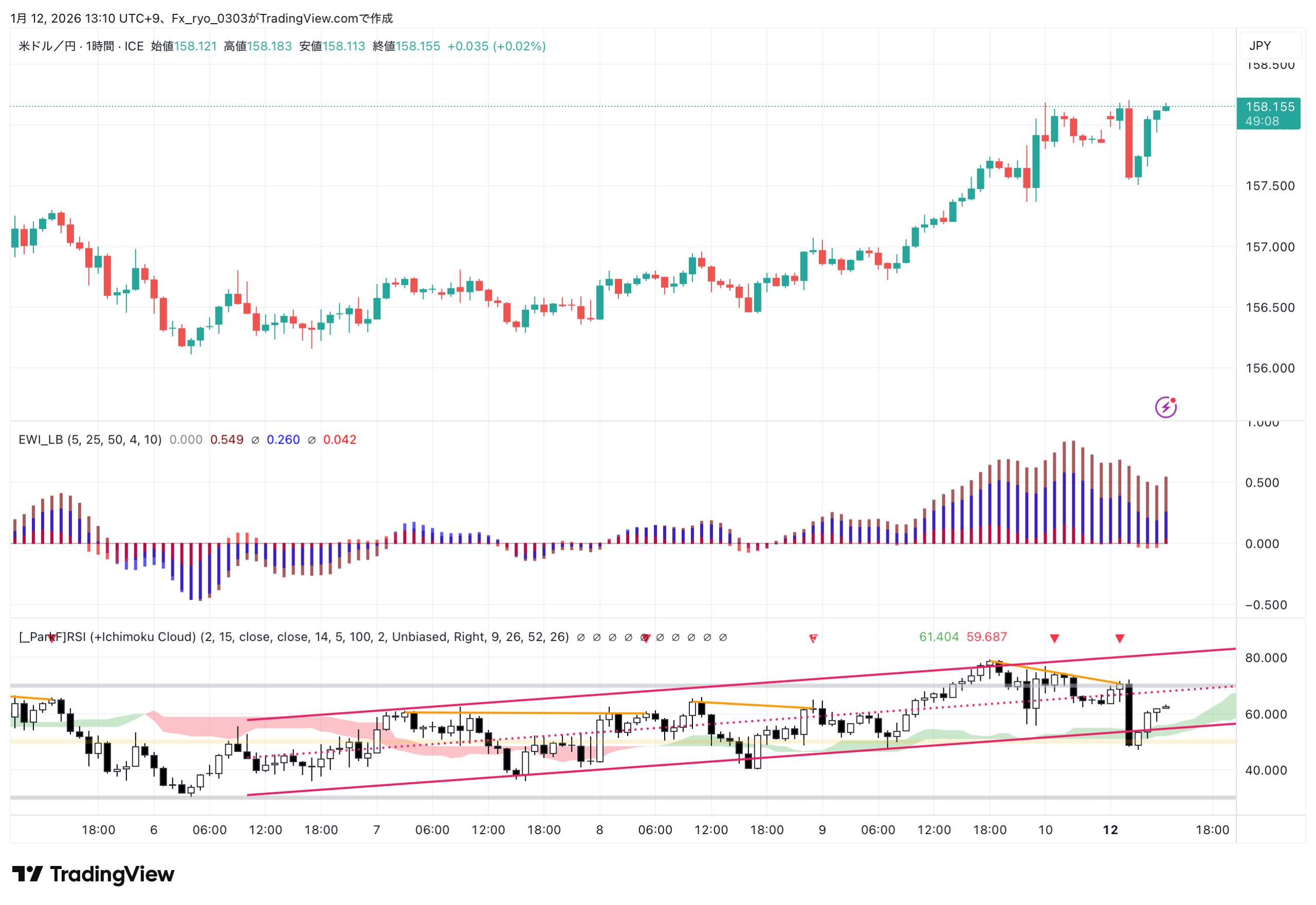 - 値幅: 156.500円 → 158.155円(約165pips上昇)