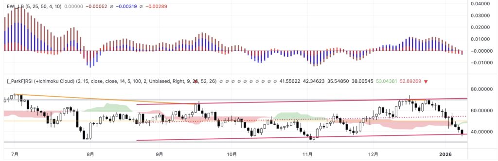 - 4時間足・1時間足: 30-40で推移、売られ過ぎゾーンに接近、短期反発の可能性