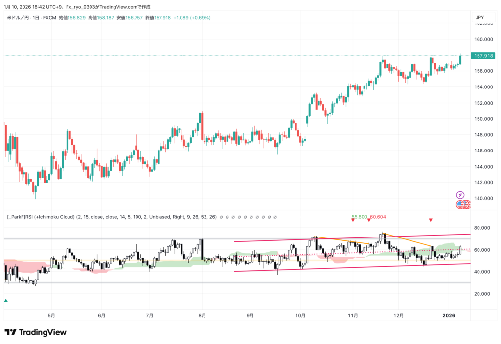 最新のチャート形状を見ると、157円台後半でダブルトップを形成しつつある可能性があります。ネックライン(156.500円付近)を明確に下抜けた場合、円高調整が深まる可能性に注意が必要です。