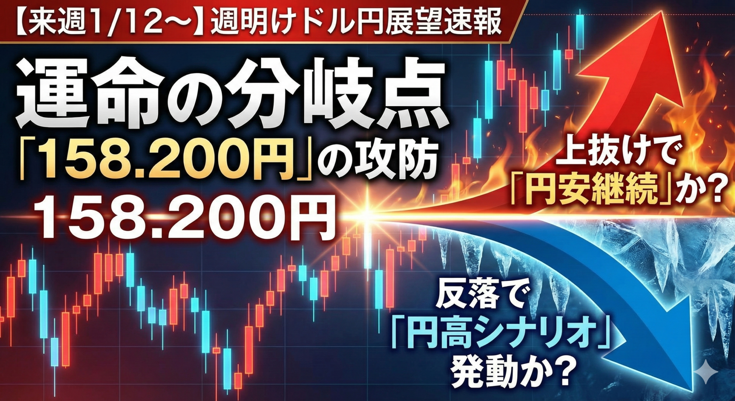 2026年1月最新のドル円相場は、長期的には円安基調を維持しつつ、短期的には調整の可能性がある局面です。来週の予想としては、158.200円を上抜ければ円安継続で160円を目指す展開、157.500円を下抜ければ円高調整で156円~154円を目指す展開が想定されます。